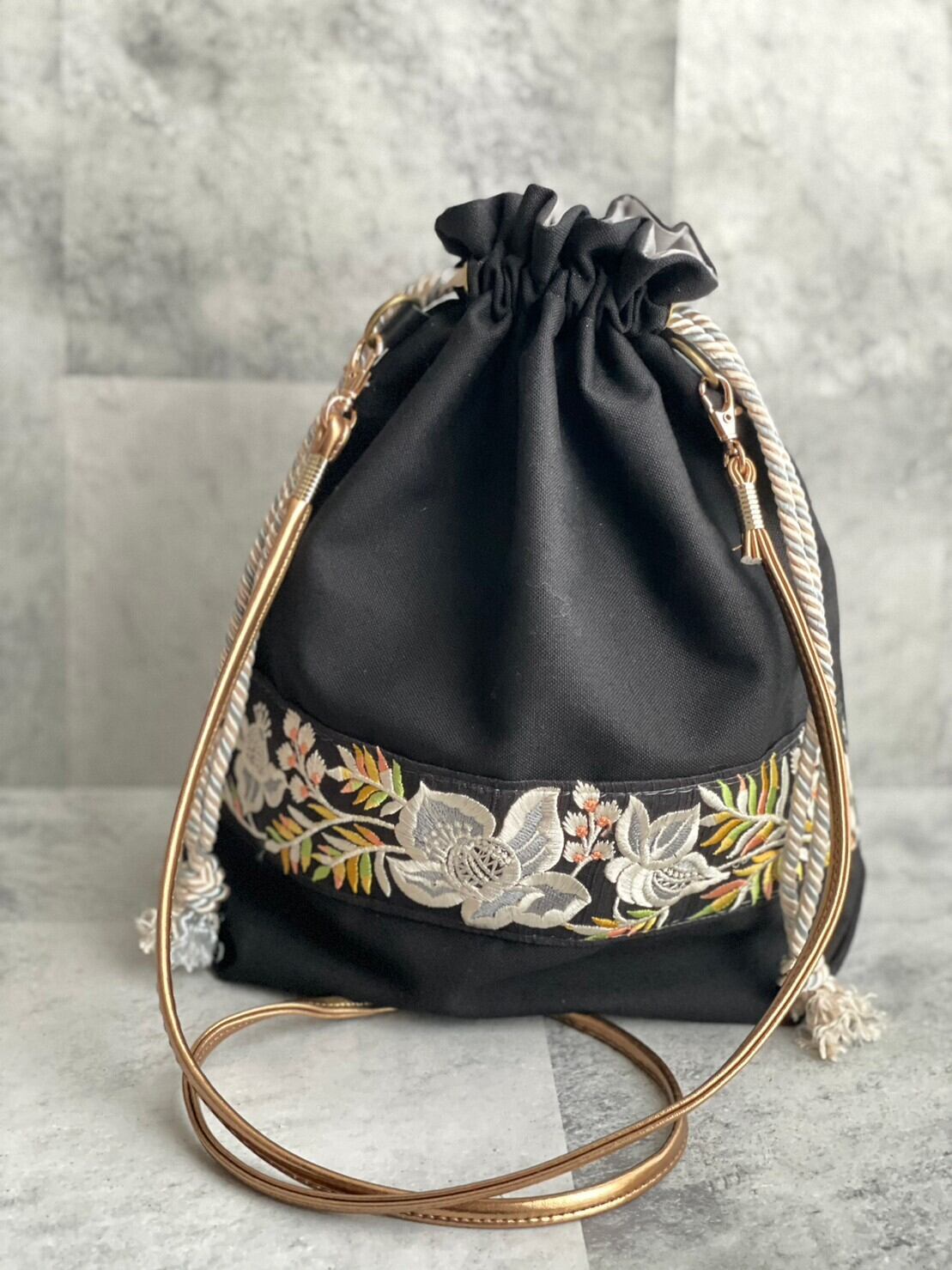 ◆繊細で華やかなインド刺繍リボンを使った巾着ショルダーバック◆